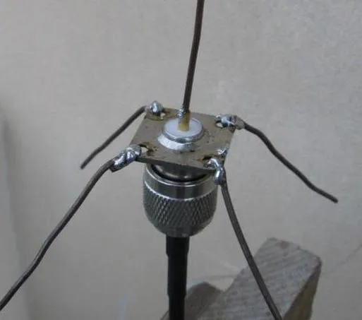 The antenna I’m currently using is a plain simple quarter-wavelength ground plane antenna, created by sticking a copper wire in the central lead of an N connector, and 4 more wires as ground, on each of the screw holes. From there I have a pigtail cable with an N connector on one side, and an RP-SMA on the other. Another adapter is needed to convert from RP-SMA to MCX on the small dongle.